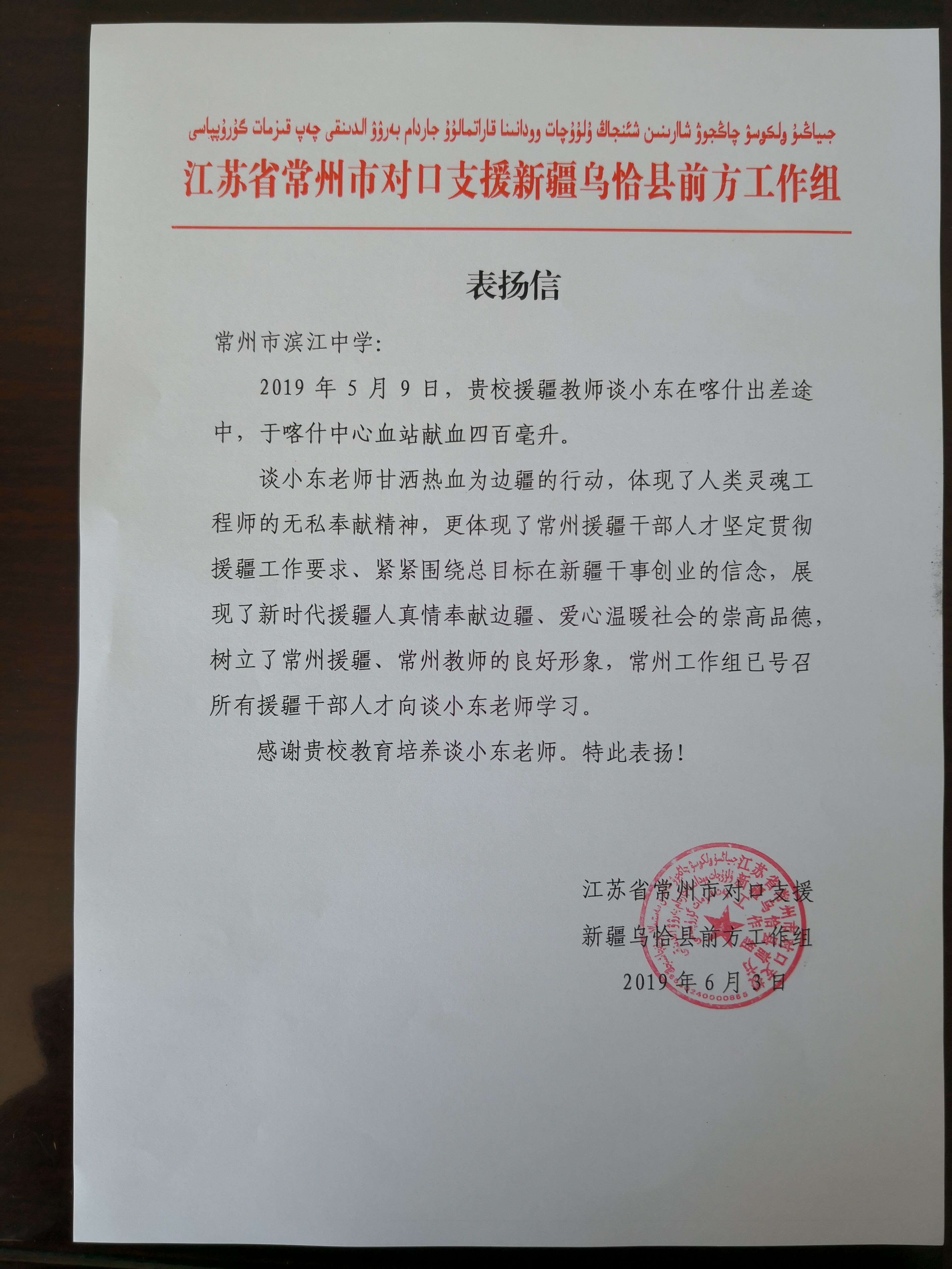 援疆工作组给我校谈小东老师的表扬信