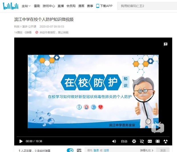 为了取得学校防疫工作的胜利,校医吴红亚老师主动放弃休息时间,通过各种权威媒体选择素材,用了近一周的时间编辑和录制了《滨江中学在校个人防护知识微视频》。网管柳列奇老师通过公众号、校园网、教师群、在线视频播放网站推出了该视频和自己制作的对新冠肺炎的科学解读、科学防护和教职员工的应知应会应做的内容等,将这些内容推送给每个教职员工,又设计了便捷的线上打卡记录方式,要求全体教职员工都要想认真学习,而且为了全员健康,学校建议教职工和家人一起学习;学发处张安娴副主任通过班主任群布置了相关工作,要求班主任们在家长群、学生群内广泛宣传,进一步普及防疫知识,提升自我防护的意识和能力,并力求做到“早知早会早做”。