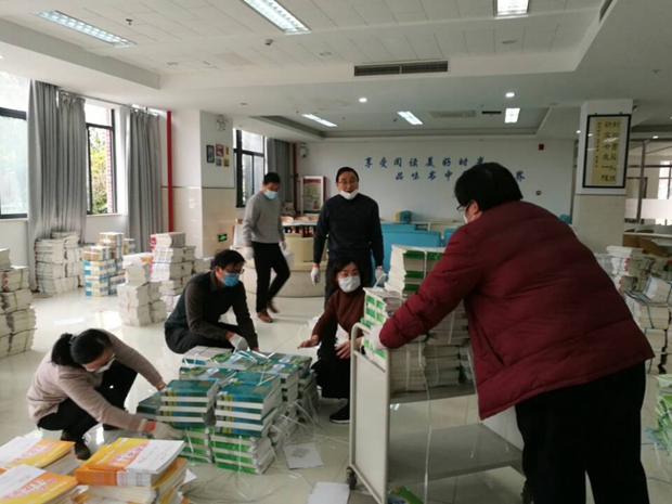 在2月底,学校针对新授课的具体情况和家长的建议要求,学校各部门提前联动,做好分发、快递教材教辅的详细方案,细致的考虑了购买每生一个包装袋、共商邮寄书目及费用、分书时的志愿者防护、分书后的场地消毒等细节。3月4日和5日,杜美菊、茅玉龙、王金权、林丹、蒋东、蒋丽辉、陈正宁、刘一桥、王佳、冯涛、丁晓杰等等数十名志愿者主动参与了分类、打包、邮递工作,使得教材在最快时间内寄达师生手中,这必将进一步提高在线学习的效果,有益于保护广大师生的视力健康,更展现了滨中人面对疫情,甘于奉献、团结一心的风采!