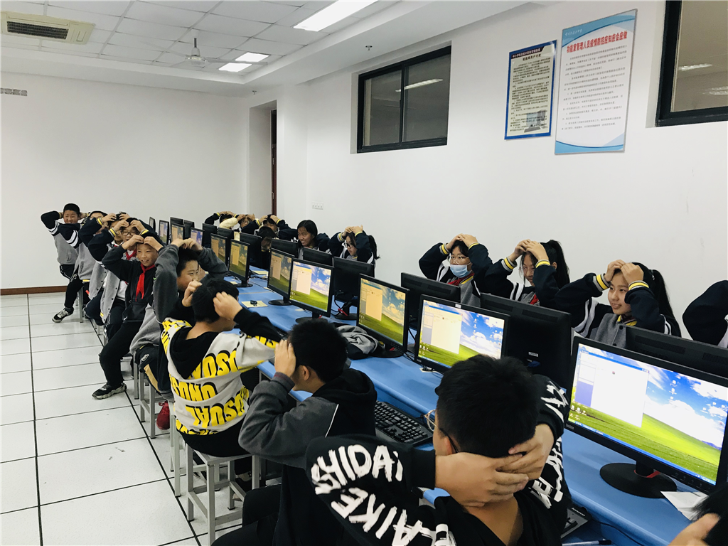 吴老师现场纠正学生眼保健操的错误姿势,学生们认真学习,并付出实践。