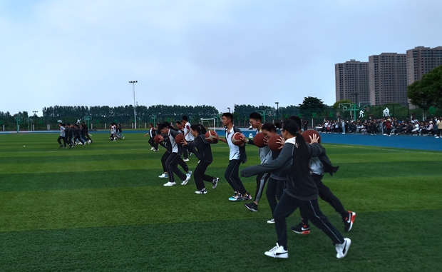 5月17日下午,七、八年级教室里安安静静、空空荡荡。不远处的操场上,四个男生、四个女生并肩而立,双臂侧平举,手掌之间分别夹着一个篮球。随着体育组陈老师的口令声响,选手们小心翼翼地向着三十米外的终点前进……