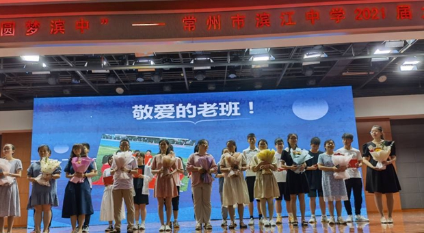 毕业证书颁发环节,各班班长郑重地从他们班主任手里接过毕业证书。同时,各班代表给班主任献上鲜花,感恩陪伴多年的最敬爱的“老班”。而家委会代表也给学校送上锦旗,表达家长对老师和学校的感谢。作为家长代表,张涛先生在发言表示:滨江中学是一所值得信赖的学校,很幸运孩子的成长有这样的学校助力!