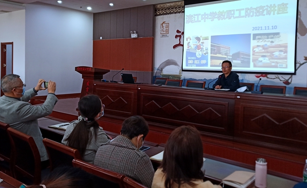 11月10日上午,常州市滨江中学副校长王建荣主持举行了全校教职工防疫讲座。王副校长首先对近期工作作了简要小结:在沈亚东校长的领导下,在各部门同志的分工协作下,学校防疫工作周密部署,积极落实;线上教学任务科学安排,落实及时。他特别感谢了班主任们在特殊时期的辛苦付出,毫无怨言。