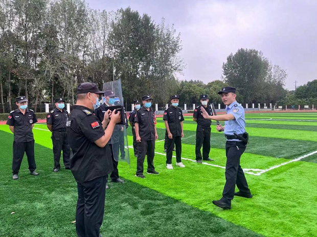 何警官先介绍了开学阶段中小学保安工作的注意事项,增强了与会保安的防范意识,又现场演示了警棍、盾牌、钢叉等保安常备工具的使用技巧,组织保安们进行了演练,提升了大家应对突发事件的能力。