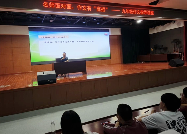 陈浩老师提出:要想写好中考作文,必须树立正确的写作观,强化作文基本功。围绕如何写好中考作文的热点话题,陈老师从审题、立意、选材、结构、文笔、卷面等方面对滨中学生展开指导。他强调了审题、立意、选材、文章结构的重要性,结合一模考题、往年的中考作文题目、考生样卷进行了详细的解读和引领。陈老师指出:当下,初中学生的作文中呈现的主要问题是:选材不符合初中生年龄特色、强行套作、刻意拔高文章思想、缺乏细腻生动的描写。他针对这些问题,一一提出改进建议。